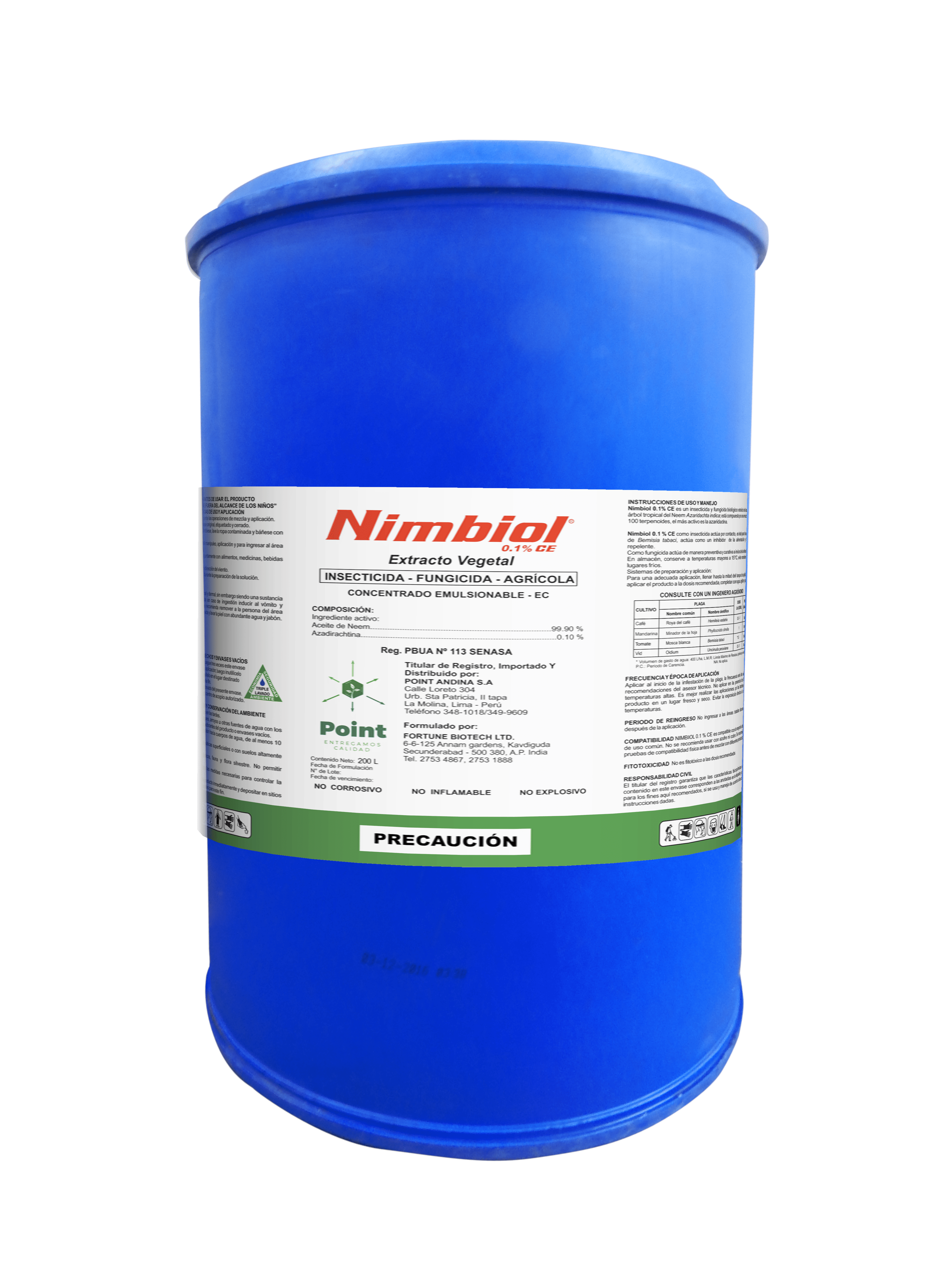 Nimbiol® 0.1 EC (Azadirachtin, Aceite de Neem), un insecticida / fungicida biológico extraído de las semillas del árbol tropical del Neem Azaridachta que actúa por contacto. Es letal para huevos y ninfas de Bemisia tabaci, así como también para larvas de lepidópteros, actúa como un inhibidor de la alimentación y tiene acción repelente. También actúa con gran eficiencia en el cultivo de café para el control de la Roya del café. indica; está compuesto por una mezcla de más de 100 terpenoides, el más activo es la azaridactina.