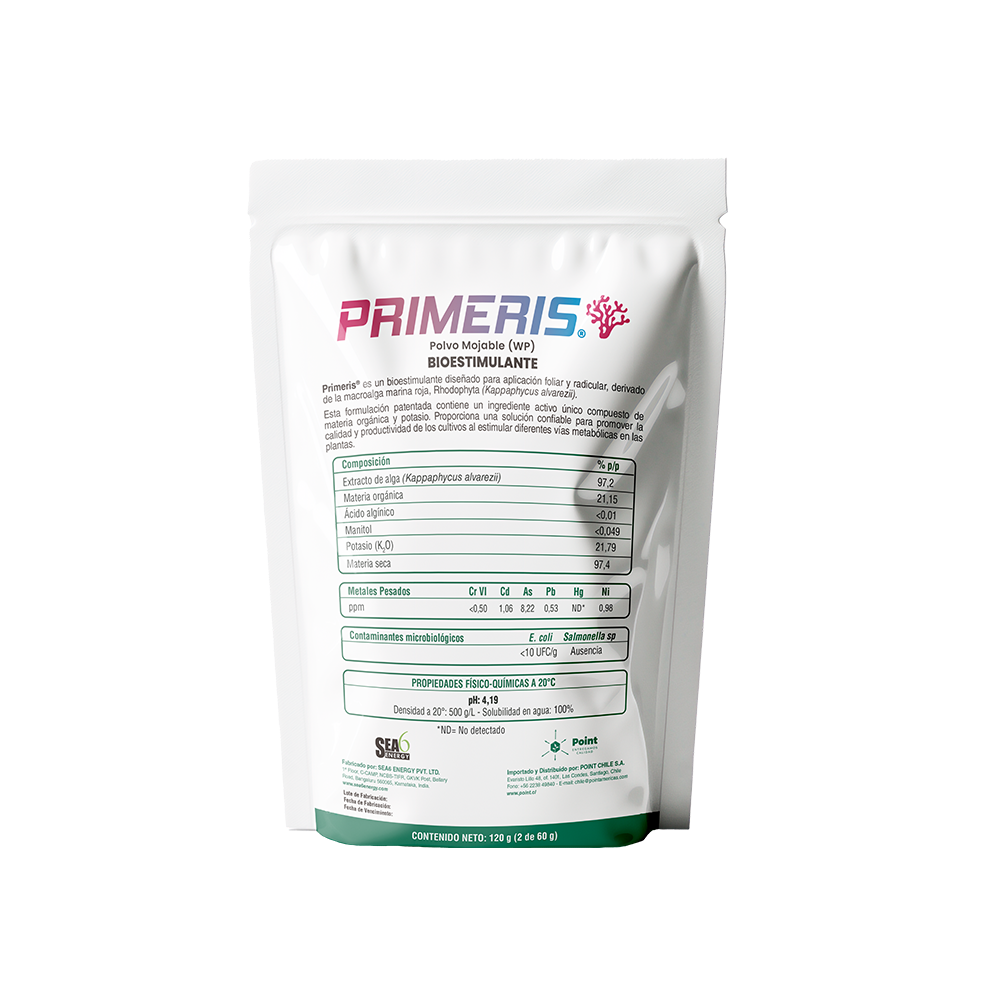 PRIMERIS® es un bioestimulante diseñado para aplicación foliar y radicular, derivado de la macroalga marina roja, Rhodophyta (Kappaphycus alvarezii). Esta formulación patentada contiene un ingrediente activo único compuesto de materia orgánica y potasio. Proporciona una solución confiable para promover la calidad y productividad de los cultivos al estimular diferentes vías metabólicas en las plantas.
